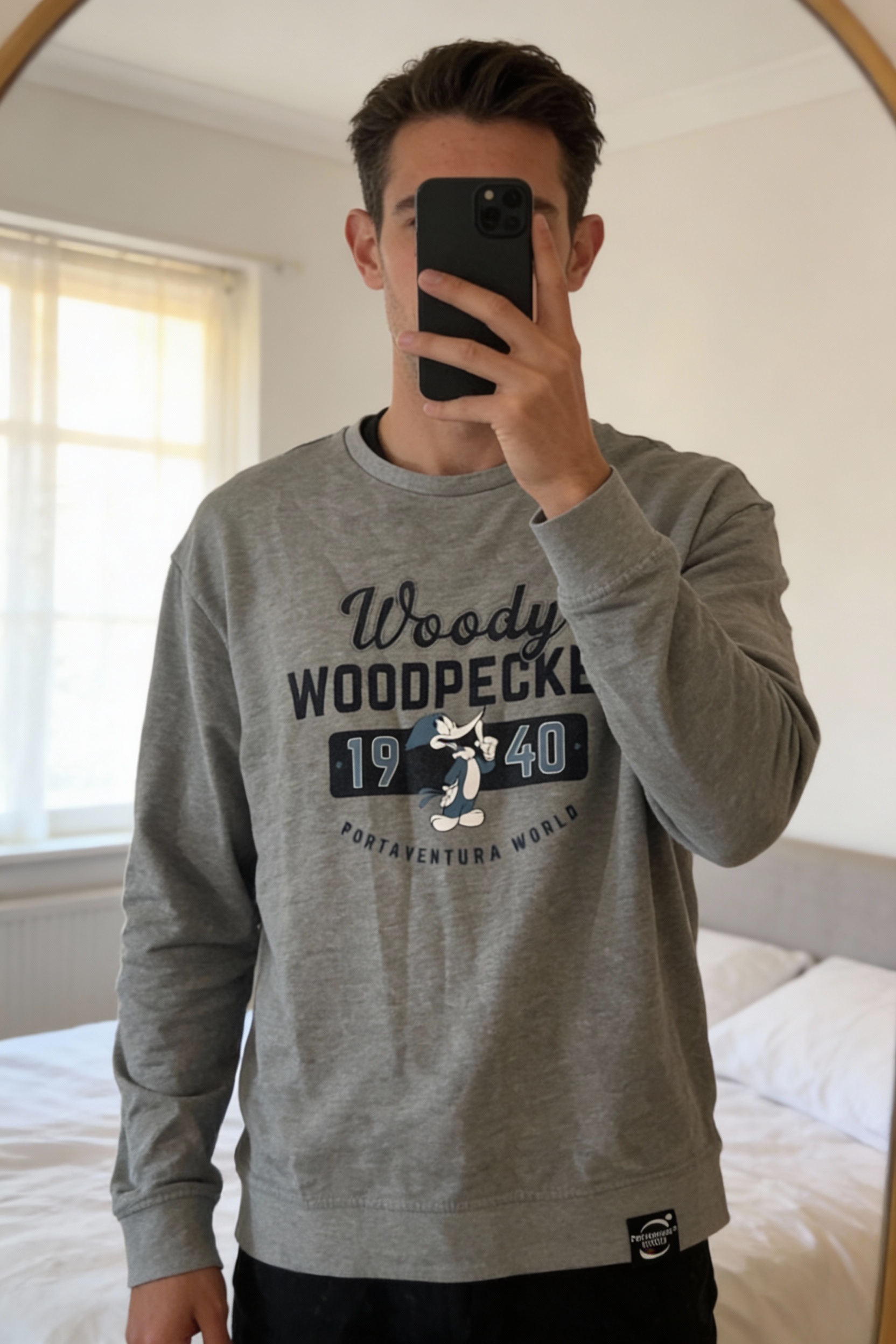 Sweat Woody Woodpecker – Port Aventura – Taille L – Comme neuf debout, face à la caméra, dans une chambre à la lumière douce, avec une lumière naturelle filtrant par la fenêtre.