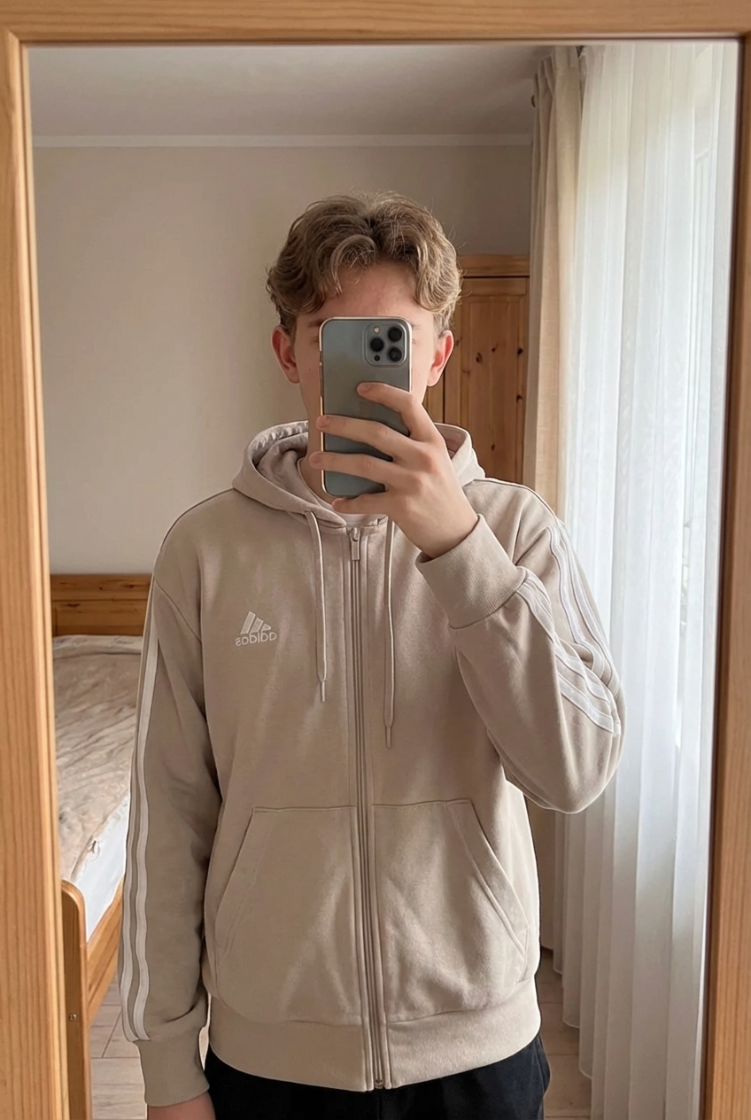 Sweat zippé Adidas – Beige – Taille M debout, face à la caméra, dans une chambre à la lumière douce, avec une lumière naturelle filtrant par la fenêtre.