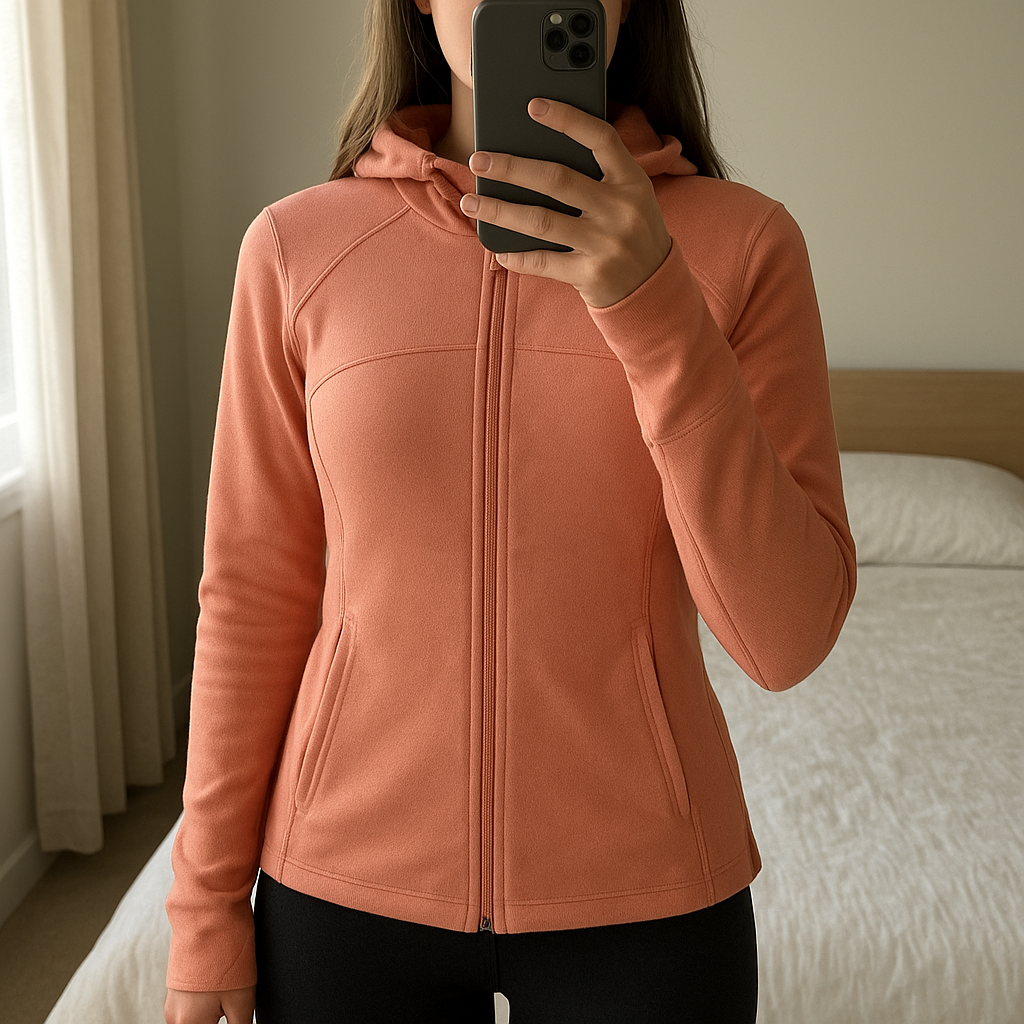 Sweaty Betty zip up hooded top - size small standing straight facing the camera, in a softly lit bedroom setting, with gentle natural light filtering through a window.