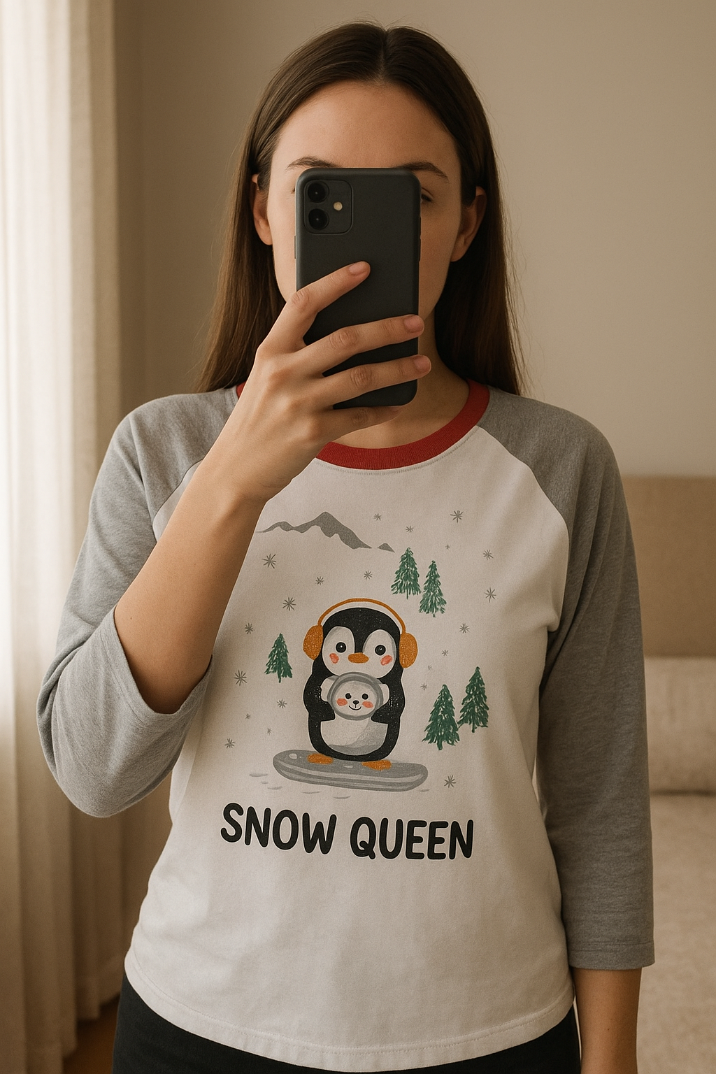 Sweet pingouin taille S/M tout doux debout, face à la caméra, dans une chambre à la lumière douce, avec une lumière naturelle filtrant par la fenêtre.