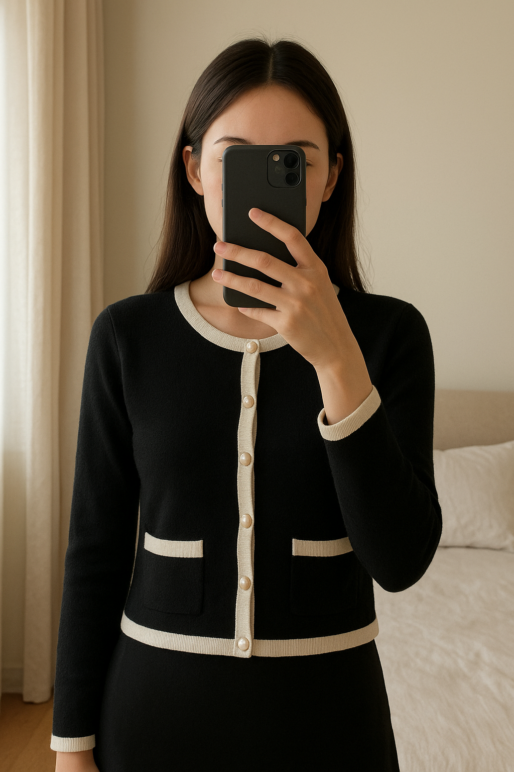 Sweterek damski czarny kardigan, ozdobne guziki, elegancki Zara standing straight facing the camera, in a softly lit bedroom setting, with gentle natural light filtering through a window.