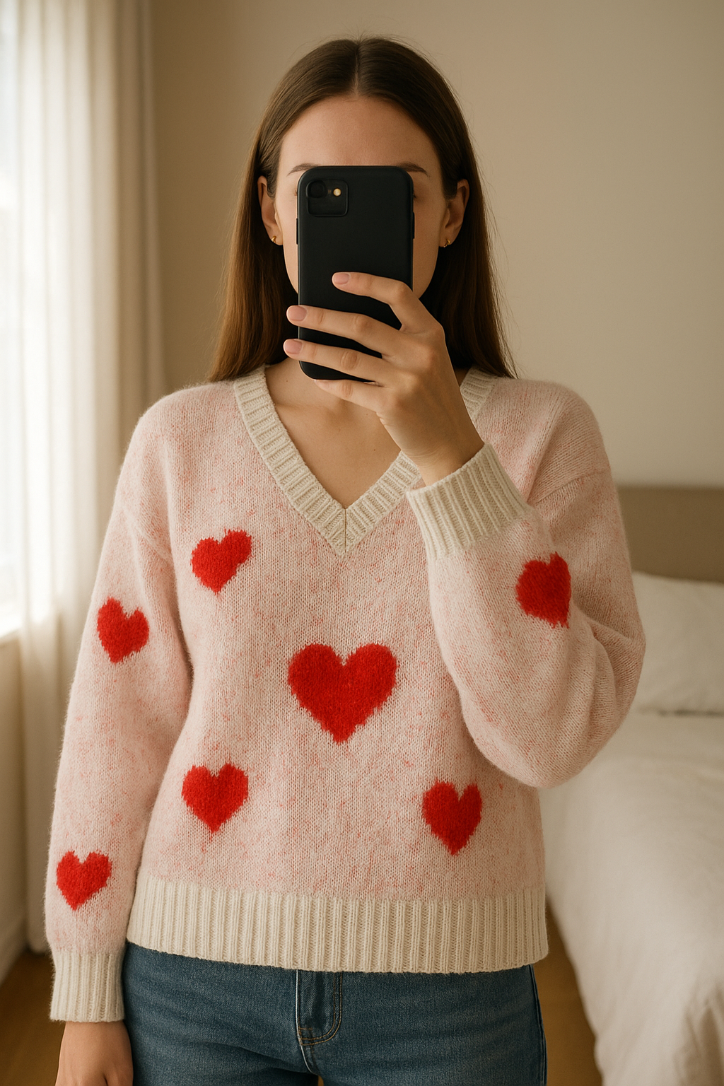 Sweterek damski, dekolt w serek, puszysty, miękki, w serduszka Zara standing straight facing the camera, in a softly lit bedroom setting, with gentle natural light filtering through a window.