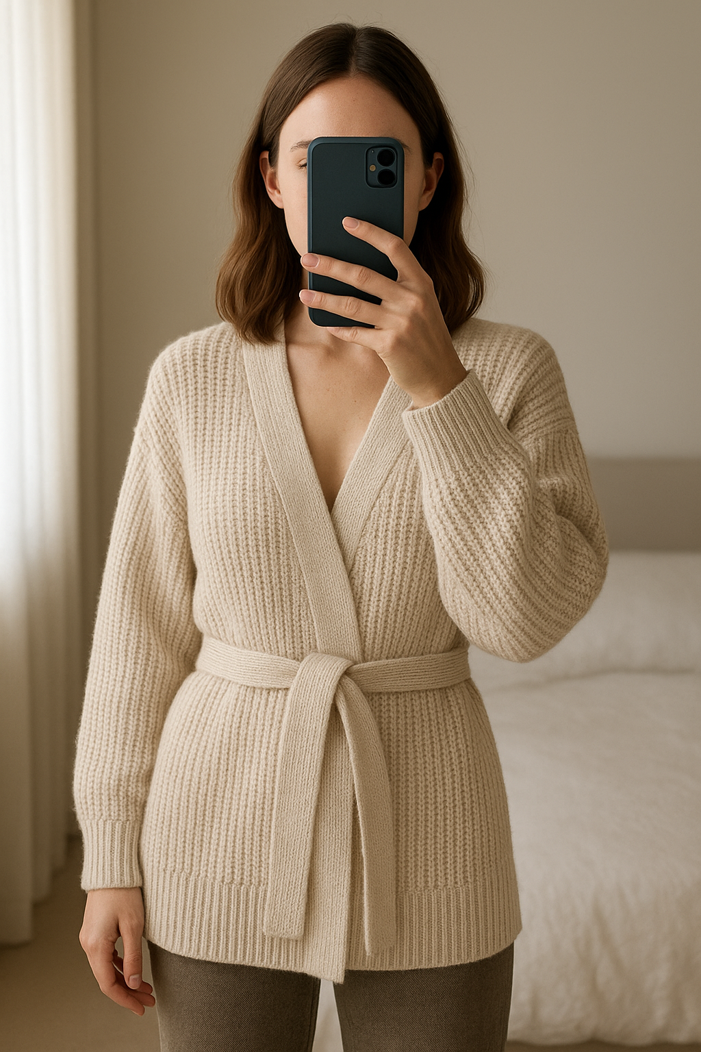 Sweterek damski kardigan, z wiązaniem, beżowy, gruby, ciepły, Zara standing straight facing the camera, in a softly lit bedroom setting, with gentle natural light filtering through a window.