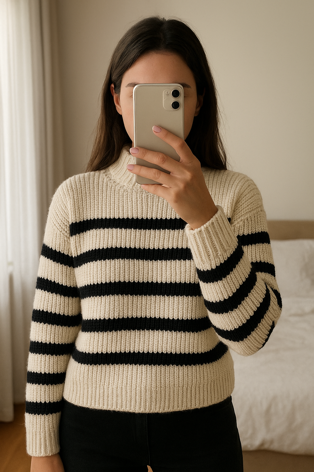 Sweterek damski w paski, krótki, z golfem, luźny miły, ciepły H&M standing straight facing the camera, in a softly lit bedroom setting, with gentle natural light filtering through a window.
