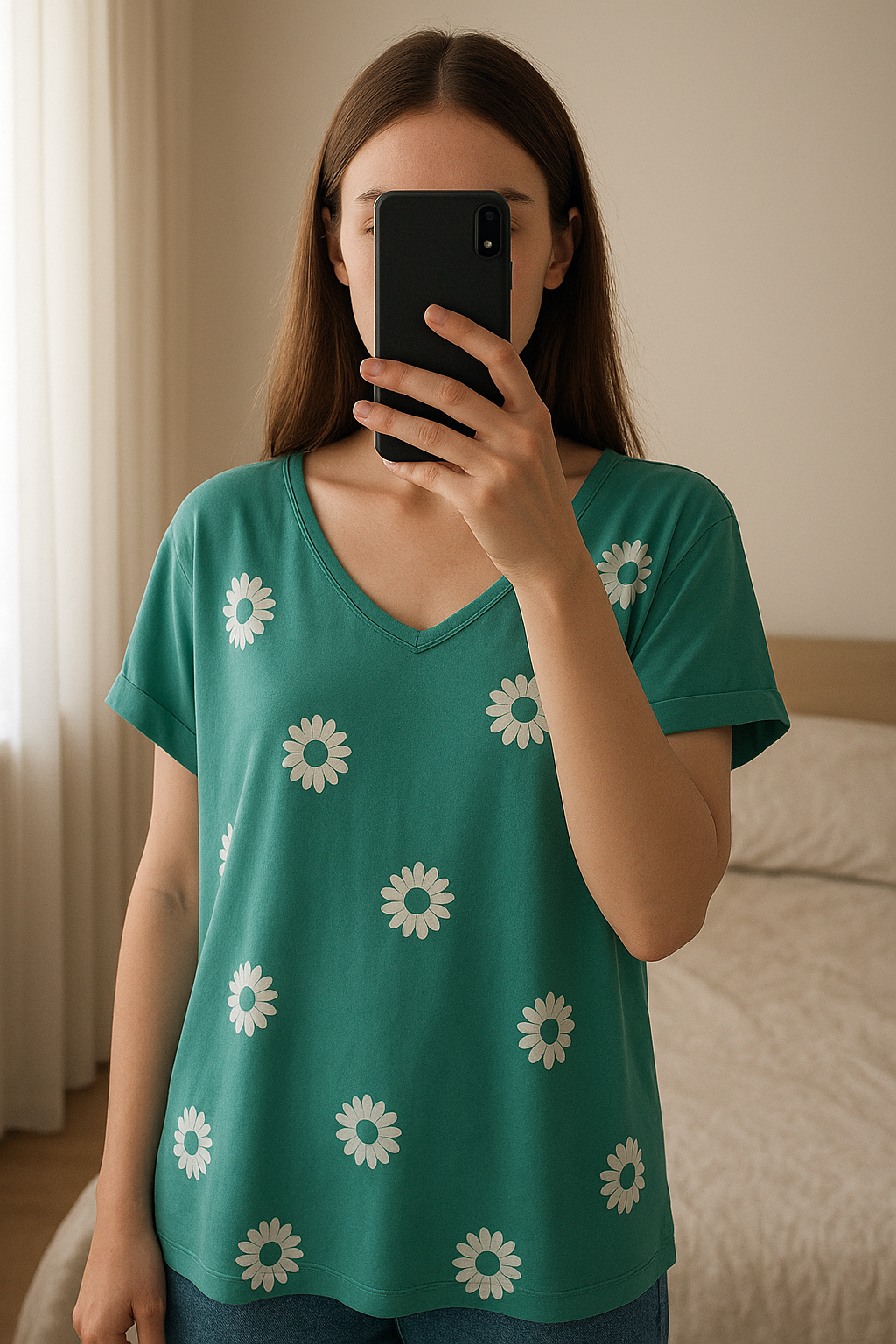 T-shirt debout, face à la caméra, dans une chambre à la lumière douce, avec une lumière naturelle filtrant par la fenêtre.