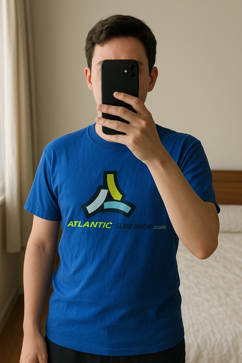 T-shirt bleu XL debout, face à la caméra, dans une chambre à la lumière douce, avec une lumière naturelle filtrant par la fenêtre.