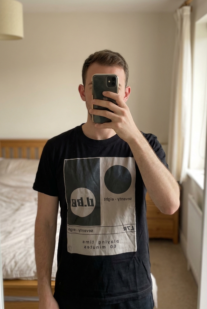 T shirt Diesel M debout, face à la caméra, dans une chambre à la lumière douce, avec une lumière naturelle filtrant par la fenêtre.
