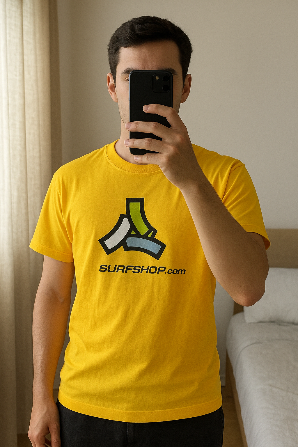 T-shirt jaune taille L Atlanticsurf debout, face à la caméra, dans une chambre à la lumière douce, avec une lumière naturelle filtrant par la fenêtre.