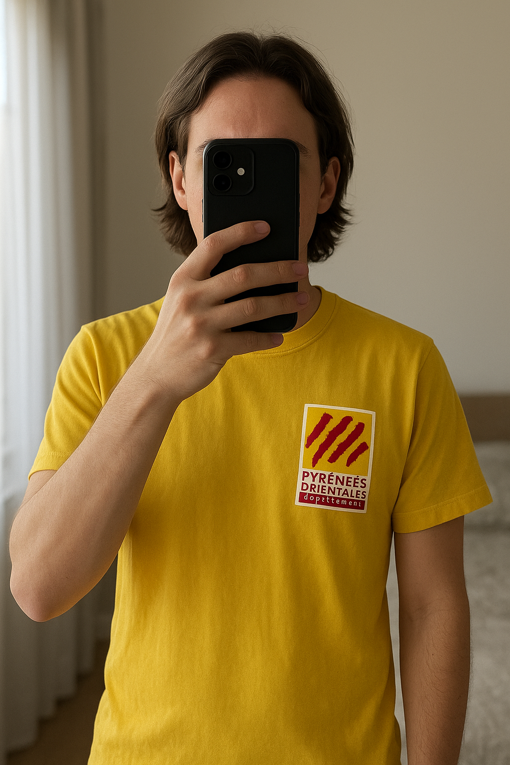 T-shirt jaune XL “ledepartement66.fr”parfait travaux debout, face à la caméra, dans une chambre à la lumière douce, avec une lumière naturelle filtrant par la fenêtre.