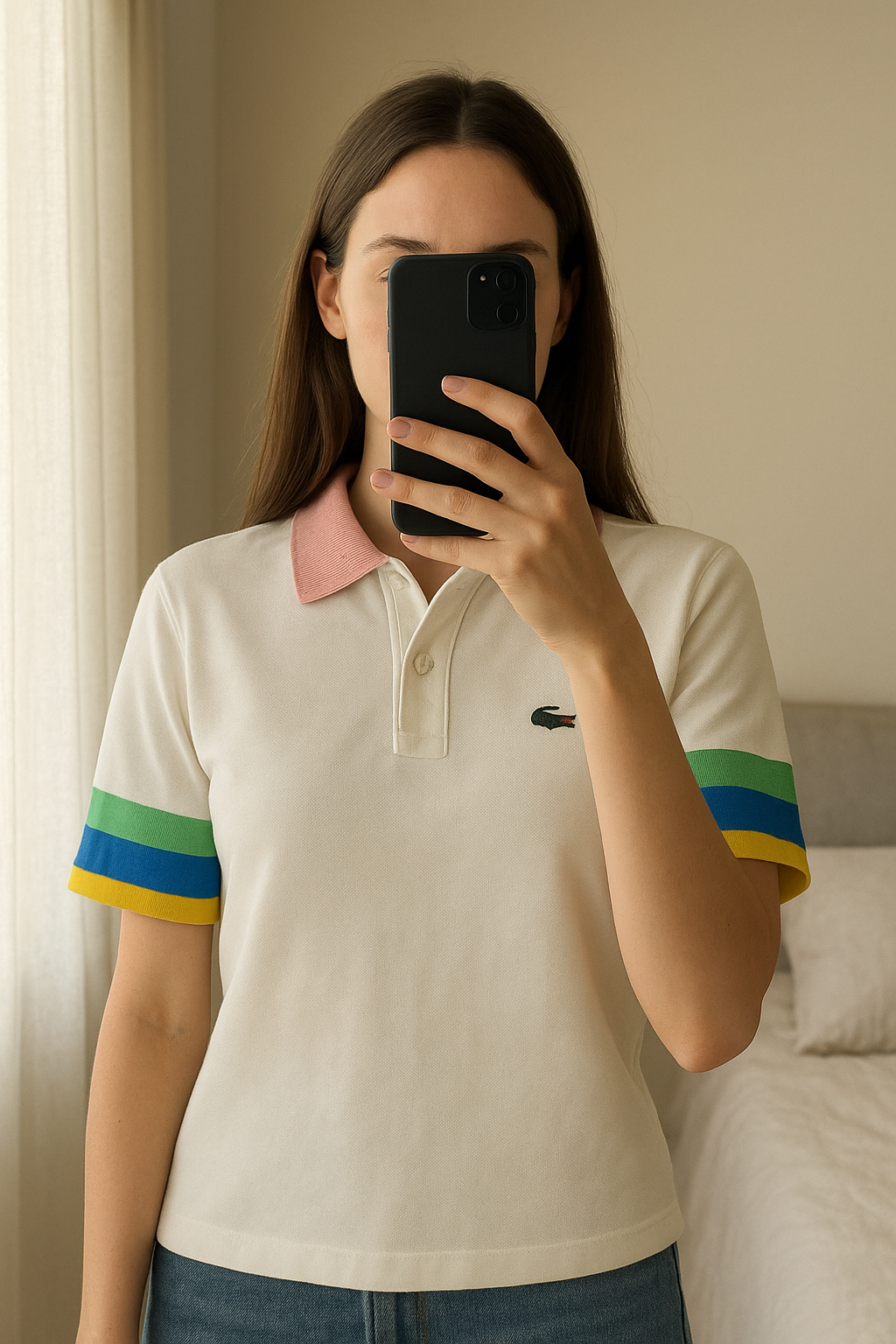 T shirt Lacoste taille 36 debout, face à la caméra, dans une chambre à la lumière douce, avec une lumière naturelle filtrant par la fenêtre.