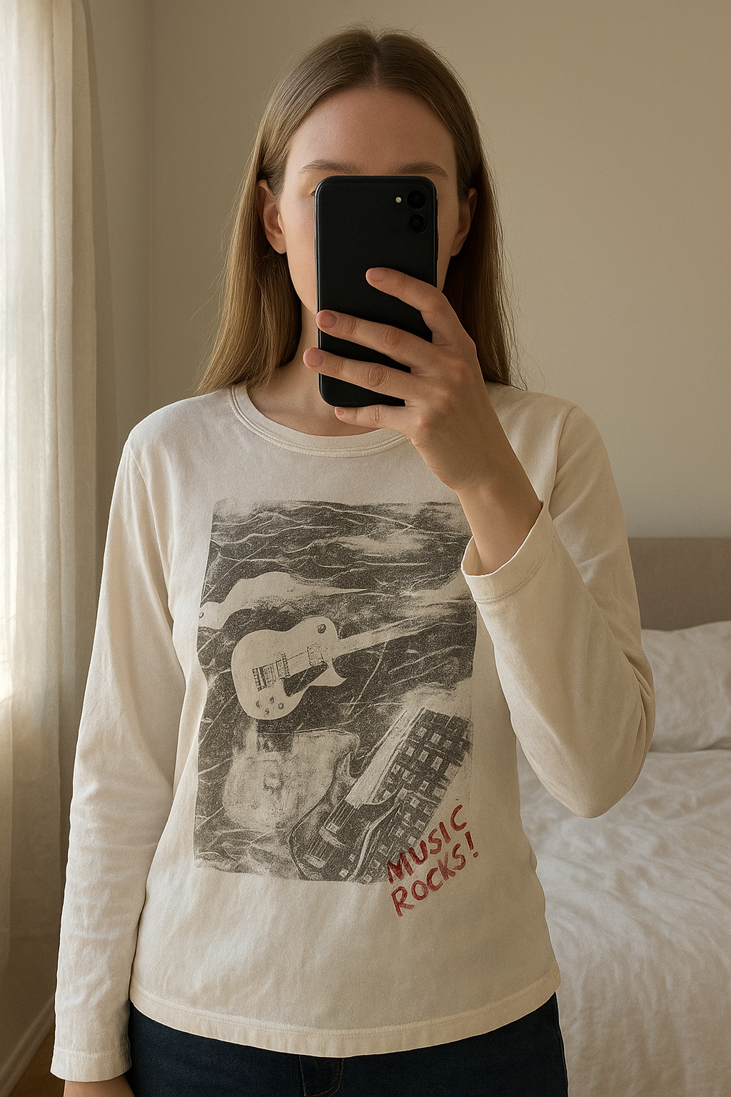 T-shirt manche longue debout, face à la caméra, dans une chambre à la lumière douce, avec une lumière naturelle filtrant par la fenêtre.