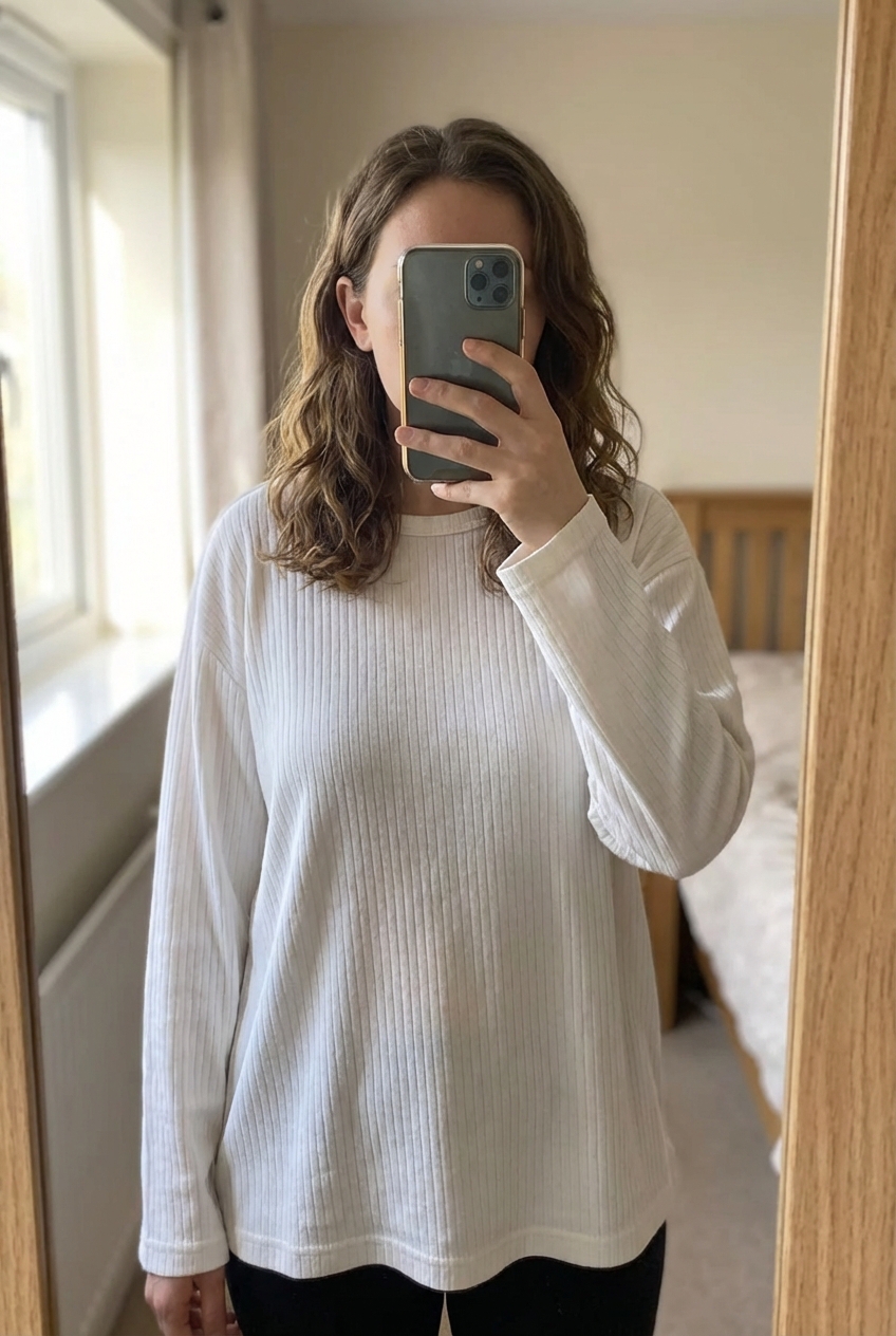 T-shirt manche longue blanc naf naf debout, face à la caméra, dans une chambre à la lumière douce, avec une lumière naturelle filtrant par la fenêtre.