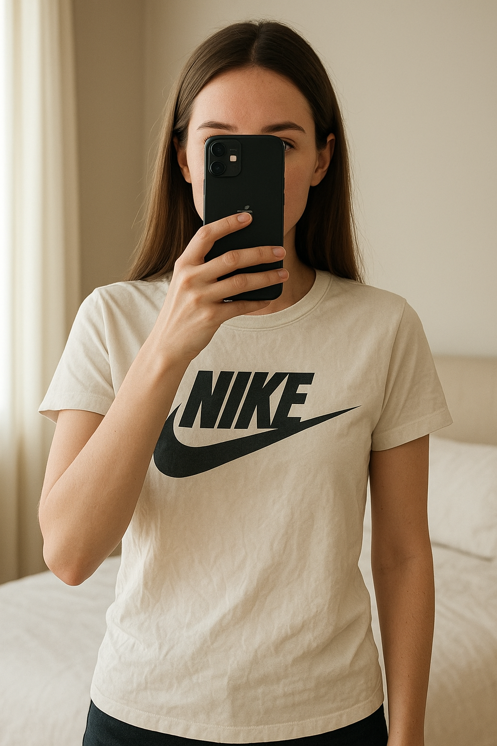 T-shirt Nike debout, face à la caméra, dans une chambre à la lumière douce, avec une lumière naturelle filtrant par la fenêtre.