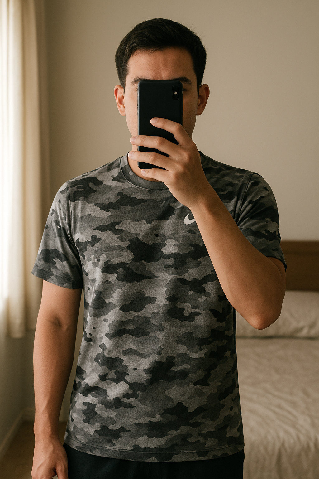 T-shirt Nike Dri-FIT camouflage gris debout, face à la caméra, dans une chambre à la lumière douce, avec une lumière naturelle filtrant par la fenêtre.