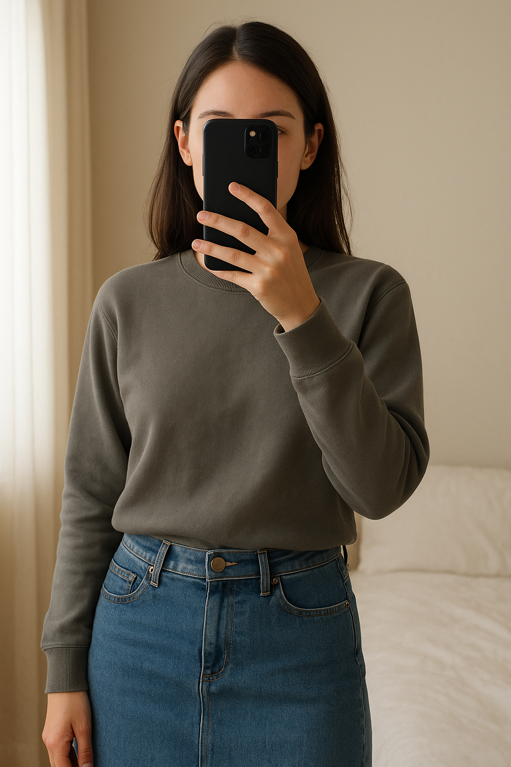 T-shirt / pull léger kaki Zadig et voltaire style friperie restock taille M debout, face à la caméra, dans une chambre à la lumière douce, avec une lumière naturelle filtrant par la fenêtre.