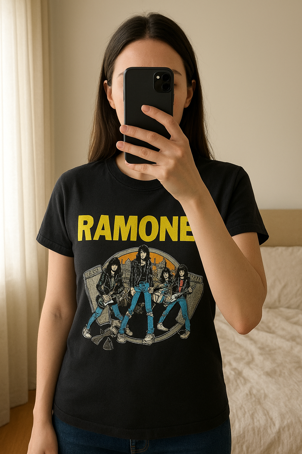 T-shirt Ramones officiel ultra vintage – Taille S (Unisexe) debout, face à la caméra, dans une chambre à la lumière douce, avec une lumière naturelle filtrant par la fenêtre.