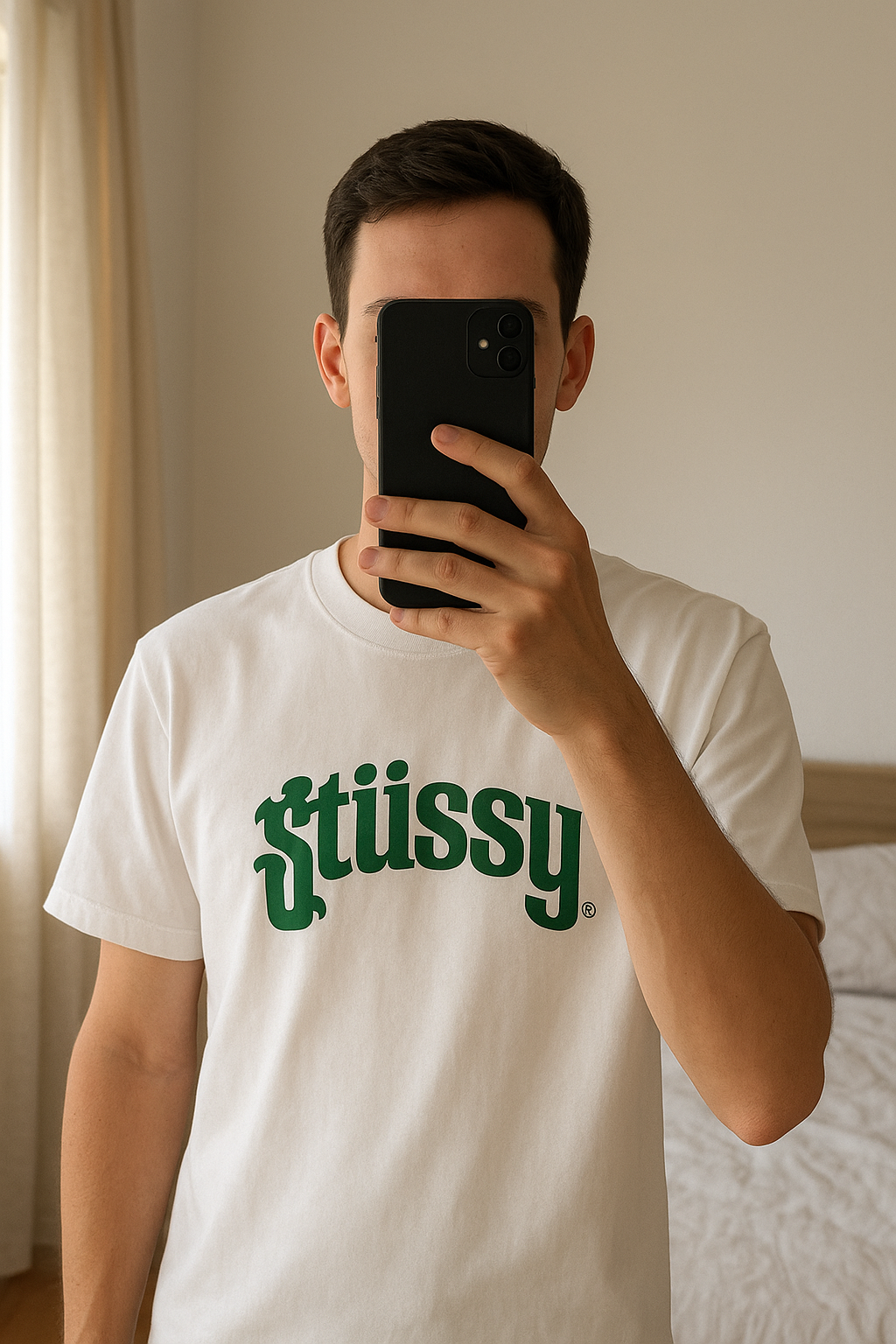t-shirt stussy green debout, face à la caméra, dans une chambre à la lumière douce, avec une lumière naturelle filtrant par la fenêtre.