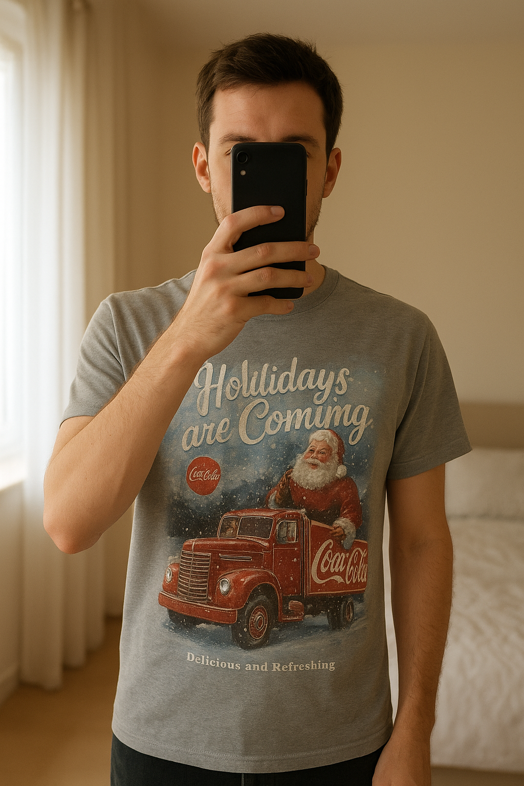Tee-shirt debout, face à la caméra, dans une chambre à la lumière douce, avec une lumière naturelle filtrant par la fenêtre.