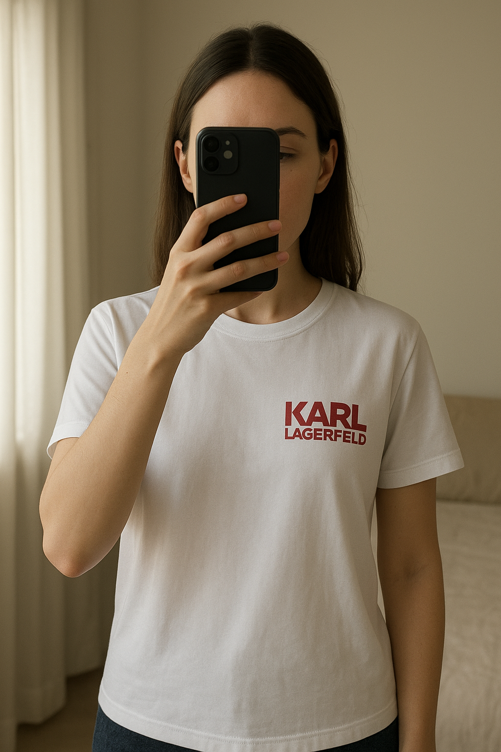 Tee-shirt debout, face à la caméra, dans une chambre à la lumière douce, avec une lumière naturelle filtrant par la fenêtre.