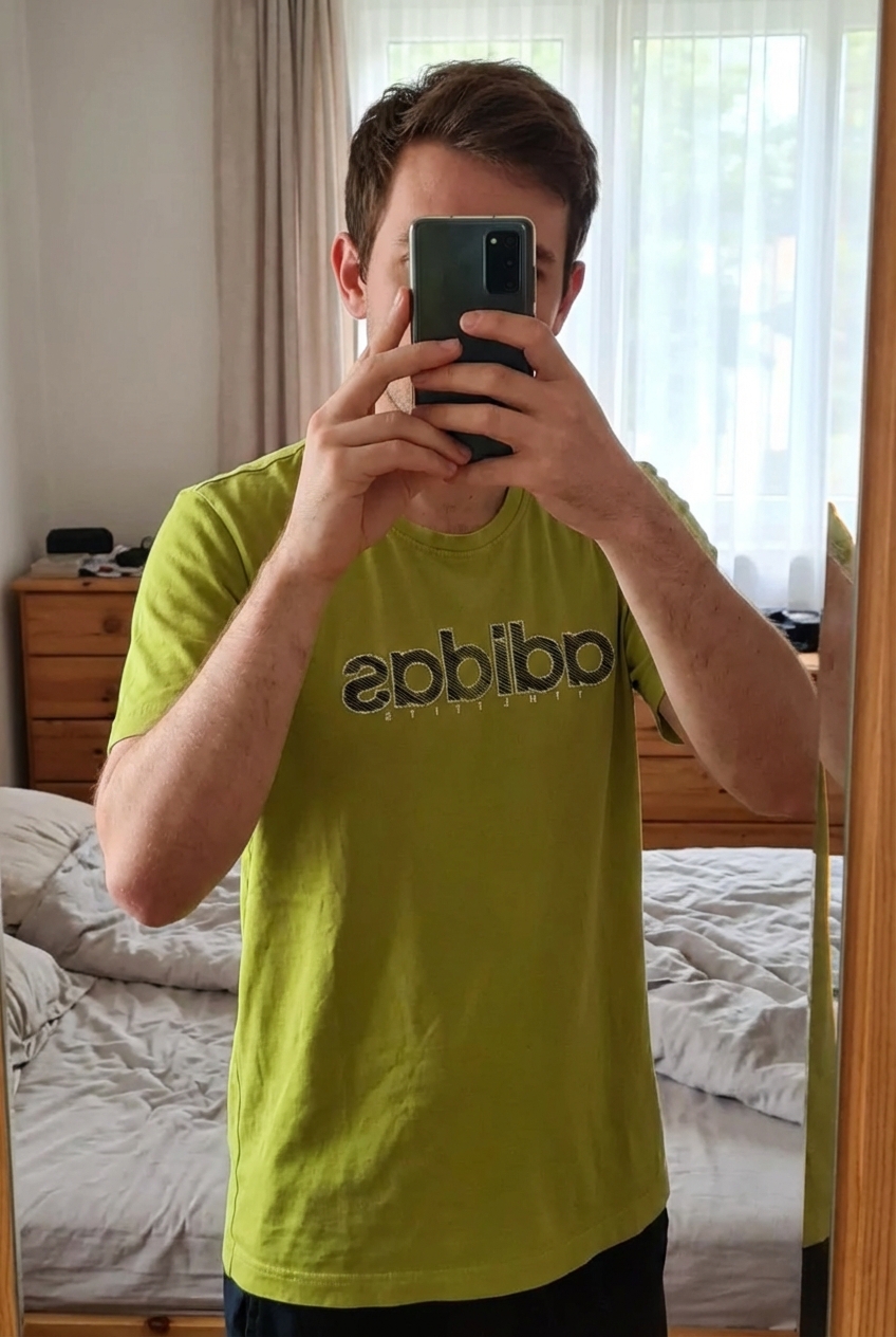 Tee-shirt Imprimé Adidas vert debout, face à la caméra, dans une chambre à la lumière douce, avec une lumière naturelle filtrant par la fenêtre.