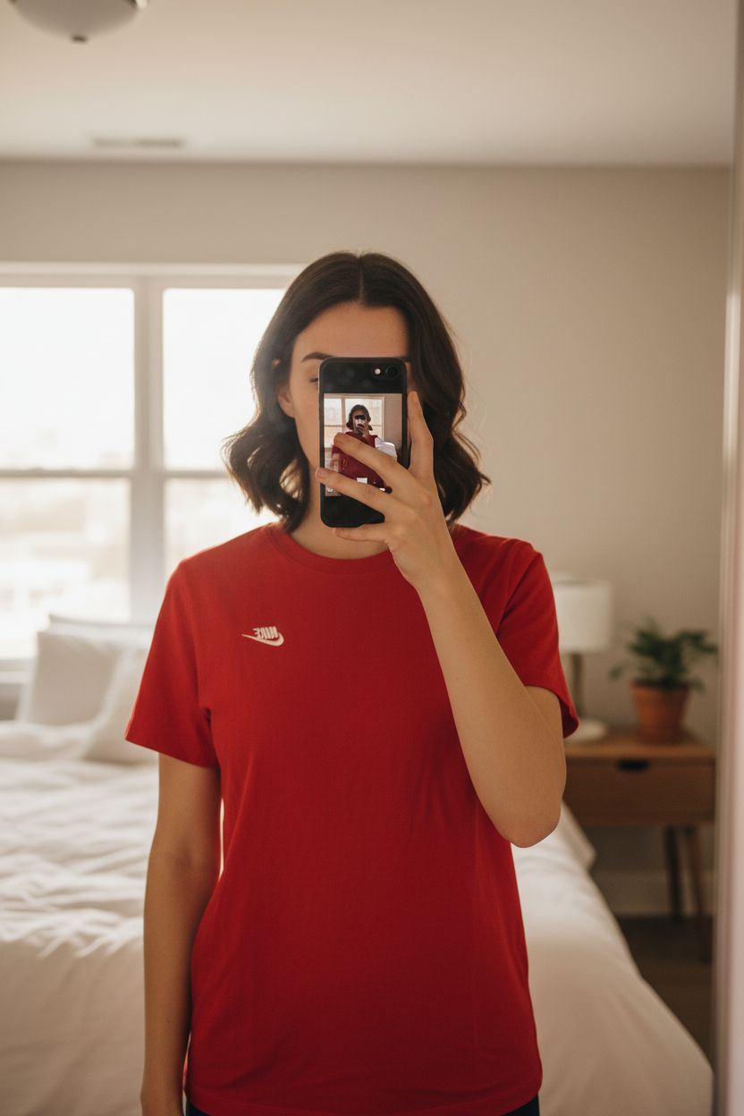 Tee shirt Nike rouge debout, face à la caméra, dans une chambre à la lumière douce, avec une lumière naturelle filtrant par la fenêtre.