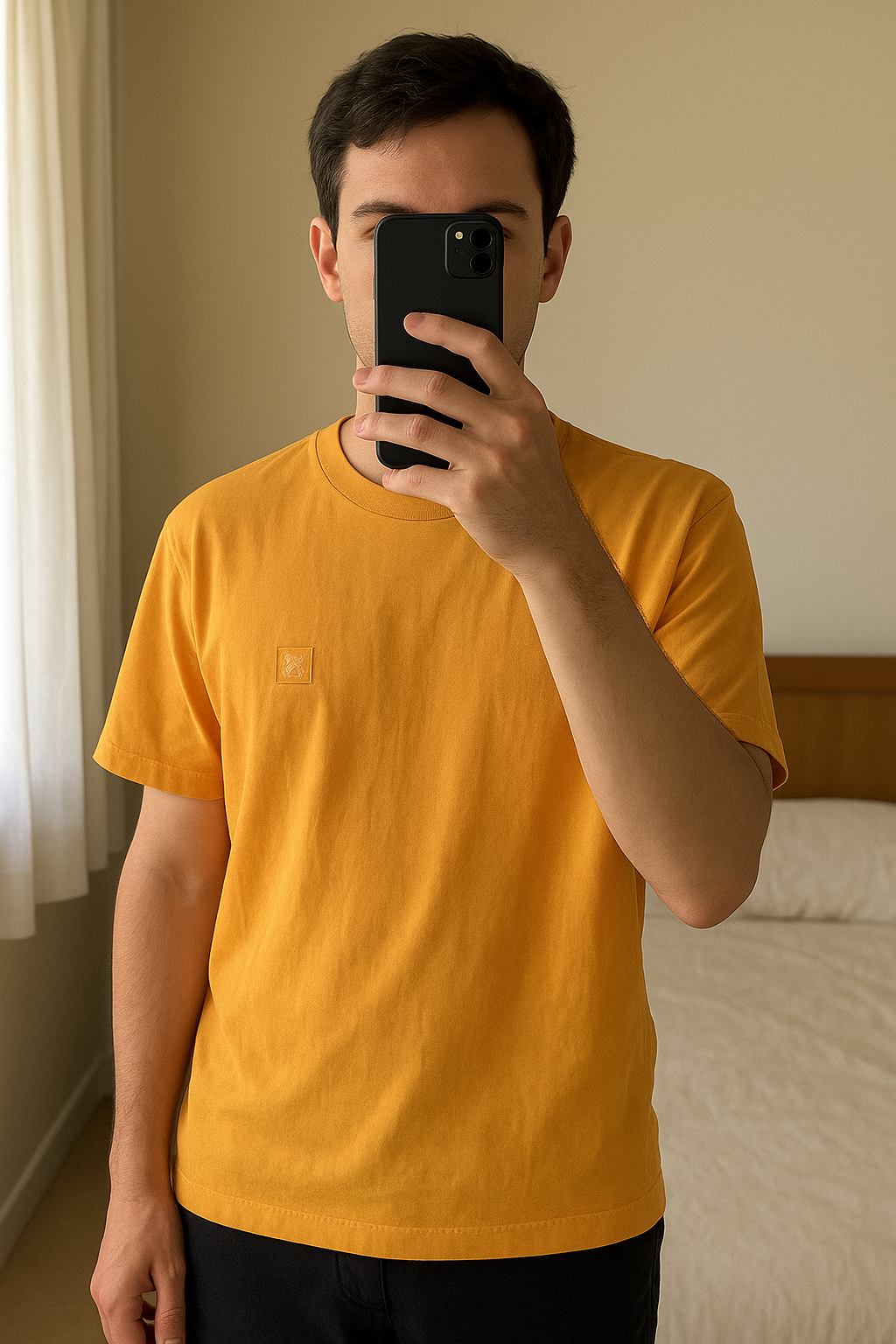 Tee shirt " Oxbow : 3 XL debout, face à la caméra, dans une chambre à la lumière douce, avec une lumière naturelle filtrant par la fenêtre.