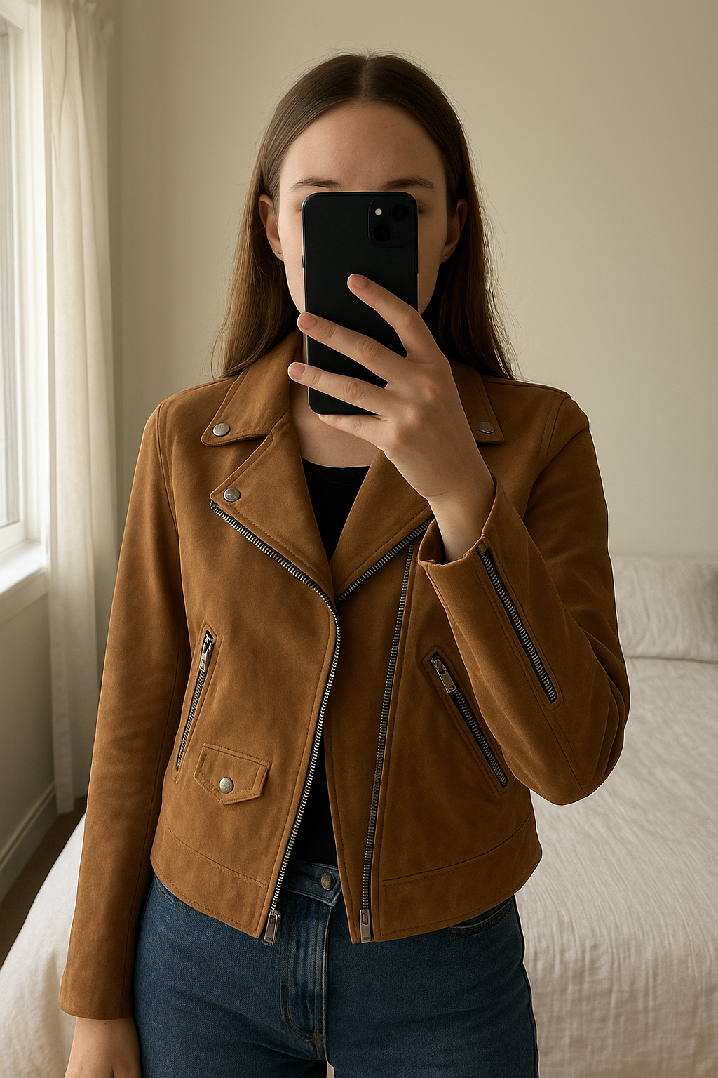 The Kooples Jacket debout, face à la caméra, dans une chambre à la lumière douce, avec une lumière naturelle filtrant par la fenêtre.