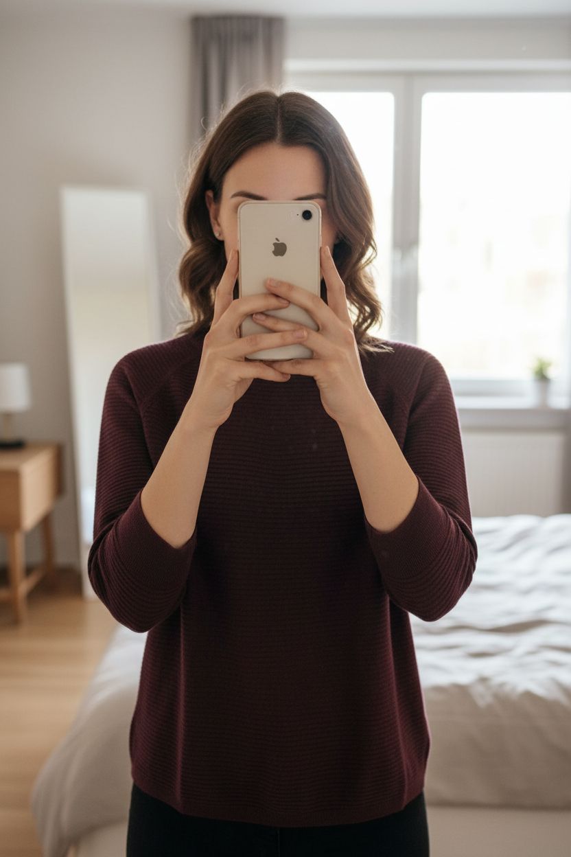 Eine Person in Toller langer Pullover oder kurzes Kleid | Gr. M aufrecht stehend, der Kamera zugewandt, mit schlanker Figur, in einem sanft beleuchteten Schlafzimmer, mit natürlichem Licht, das durch ein Fenster fällt.