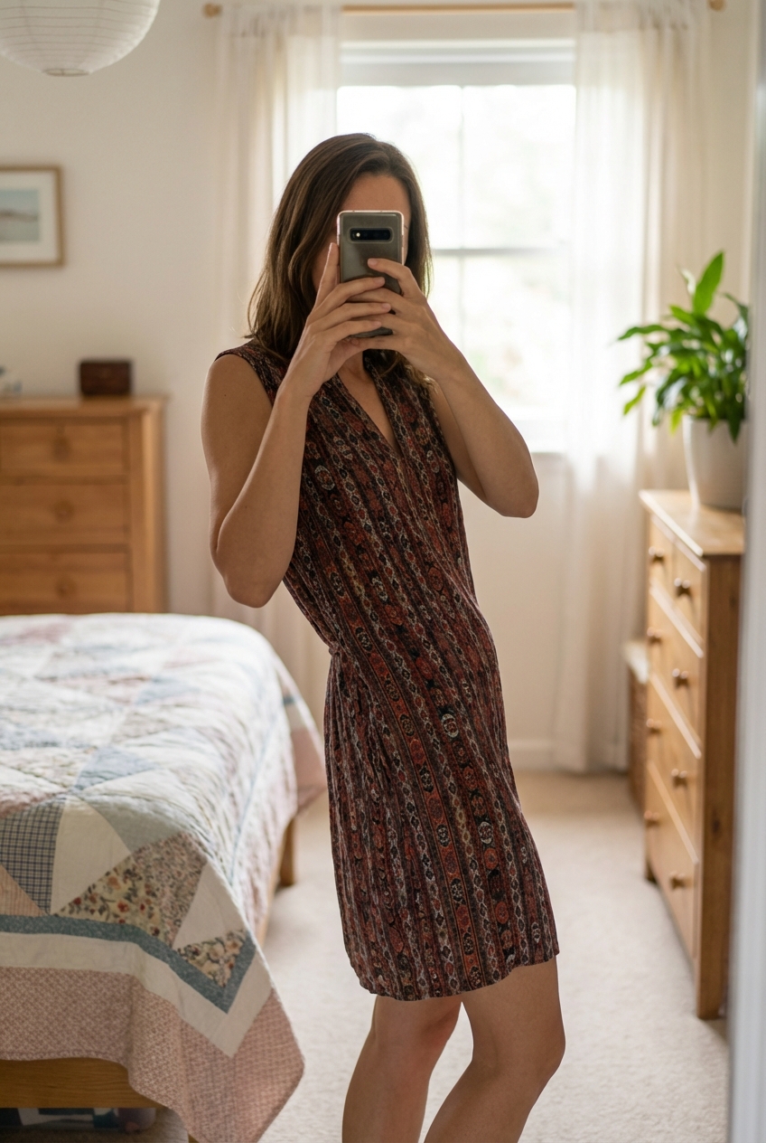 Eine Person in Tolles Kleid mit schönem Muster | Gr. M den Rücken leicht gewölbt für eine dynamische Pose, mit schlanker Figur, in einem sanft beleuchteten Schlafzimmer, mit natürlichem Licht, das durch ein Fenster fällt.