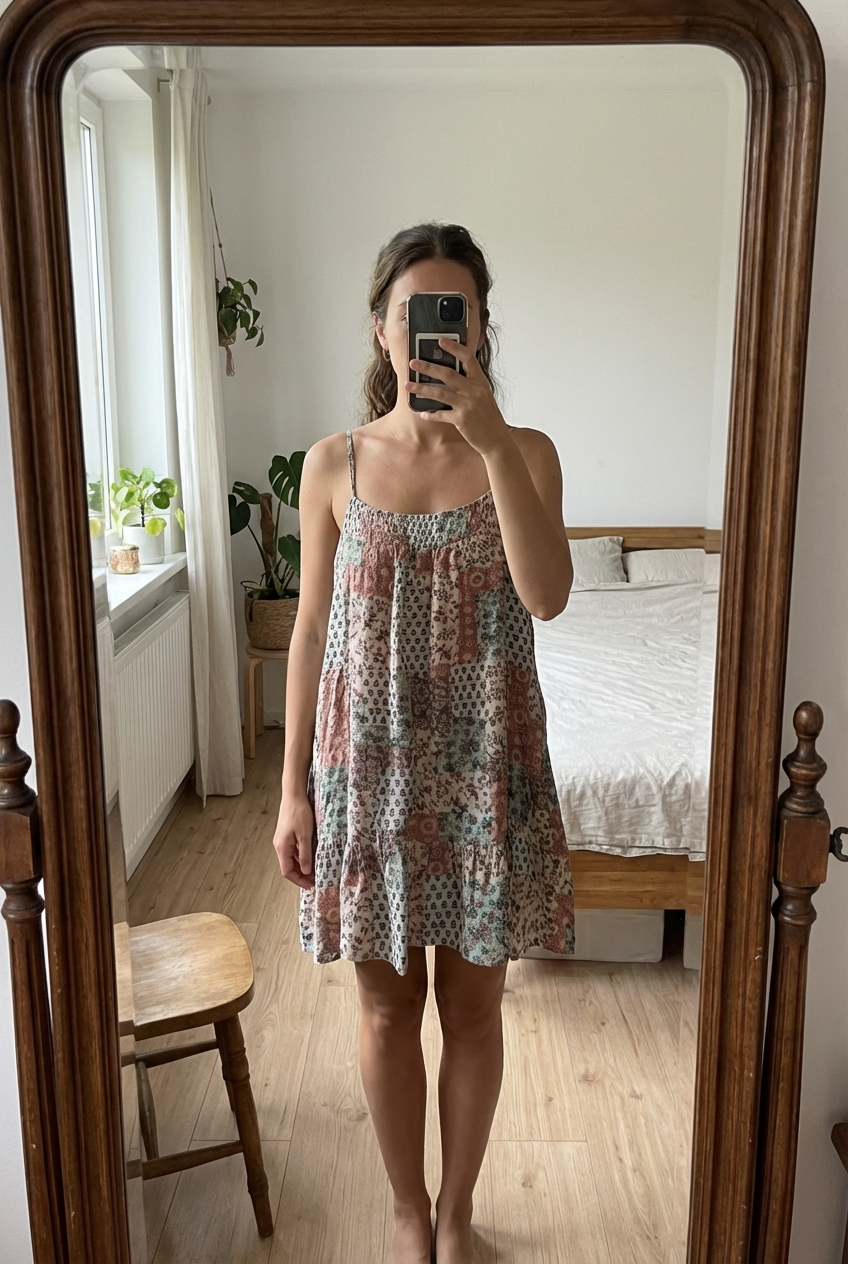 Eine Person in Tolles kurzes Kleid | Gr. M aufrecht stehend, der Kamera zugewandt, mit schlanker Figur, in einem sanft beleuchteten Schlafzimmer, mit natürlichem Licht, das durch ein Fenster fällt.