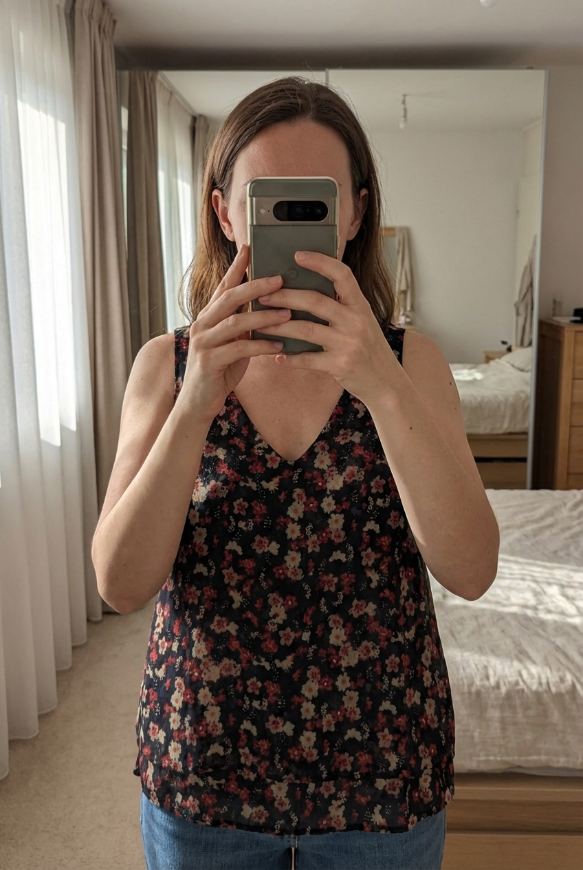 Tolles, leichtes Blumentop | Gr. 36 aufrecht stehend, der Kamera zugewandt, in einem sanft beleuchteten Schlafzimmer, mit natürlichem Licht, das durch ein Fenster fällt.
