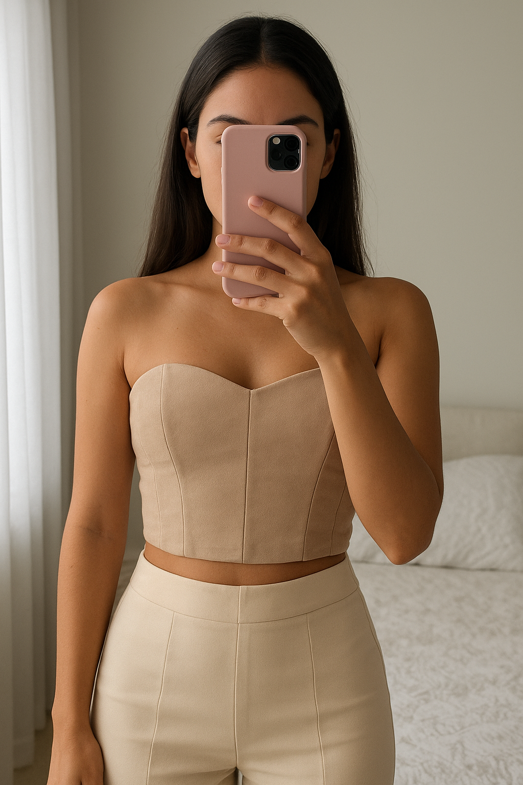 Top bustier en daim beige debout, face à la caméra, dans une chambre à la lumière douce, avec une lumière naturelle filtrant par la fenêtre.