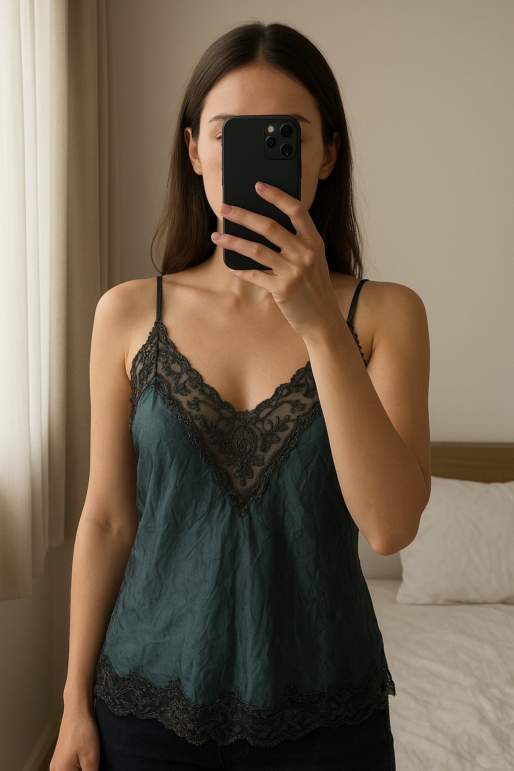 Top Caroll brodés taille 40 debout, face à la caméra, dans une chambre à la lumière douce, avec une lumière naturelle filtrant par la fenêtre.