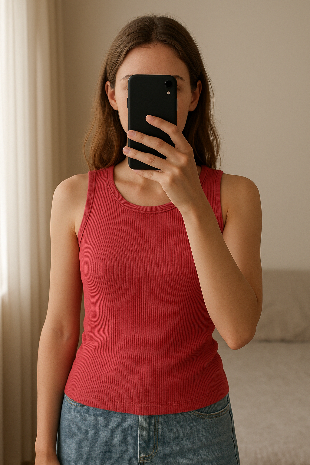 Top court debout, face à la caméra, dans une chambre à la lumière douce, avec une lumière naturelle filtrant par la fenêtre.