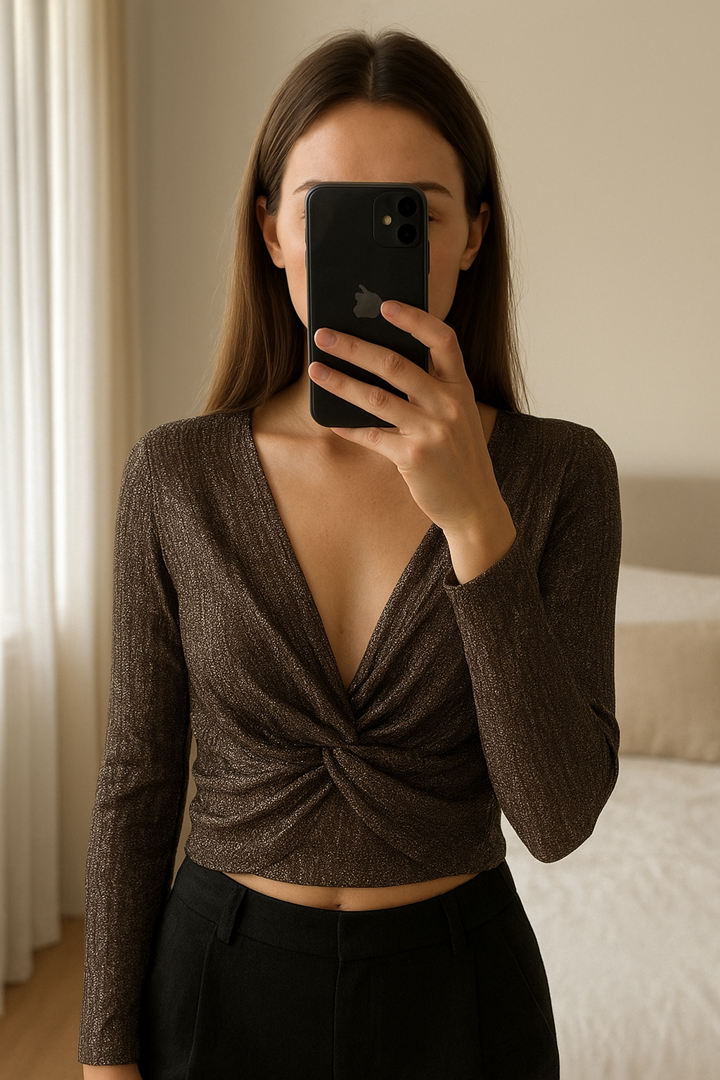 🪩Top court échancré pimkie à paillette 🪩 debout, face à la caméra, dans une chambre à la lumière douce, avec une lumière naturelle filtrant par la fenêtre.