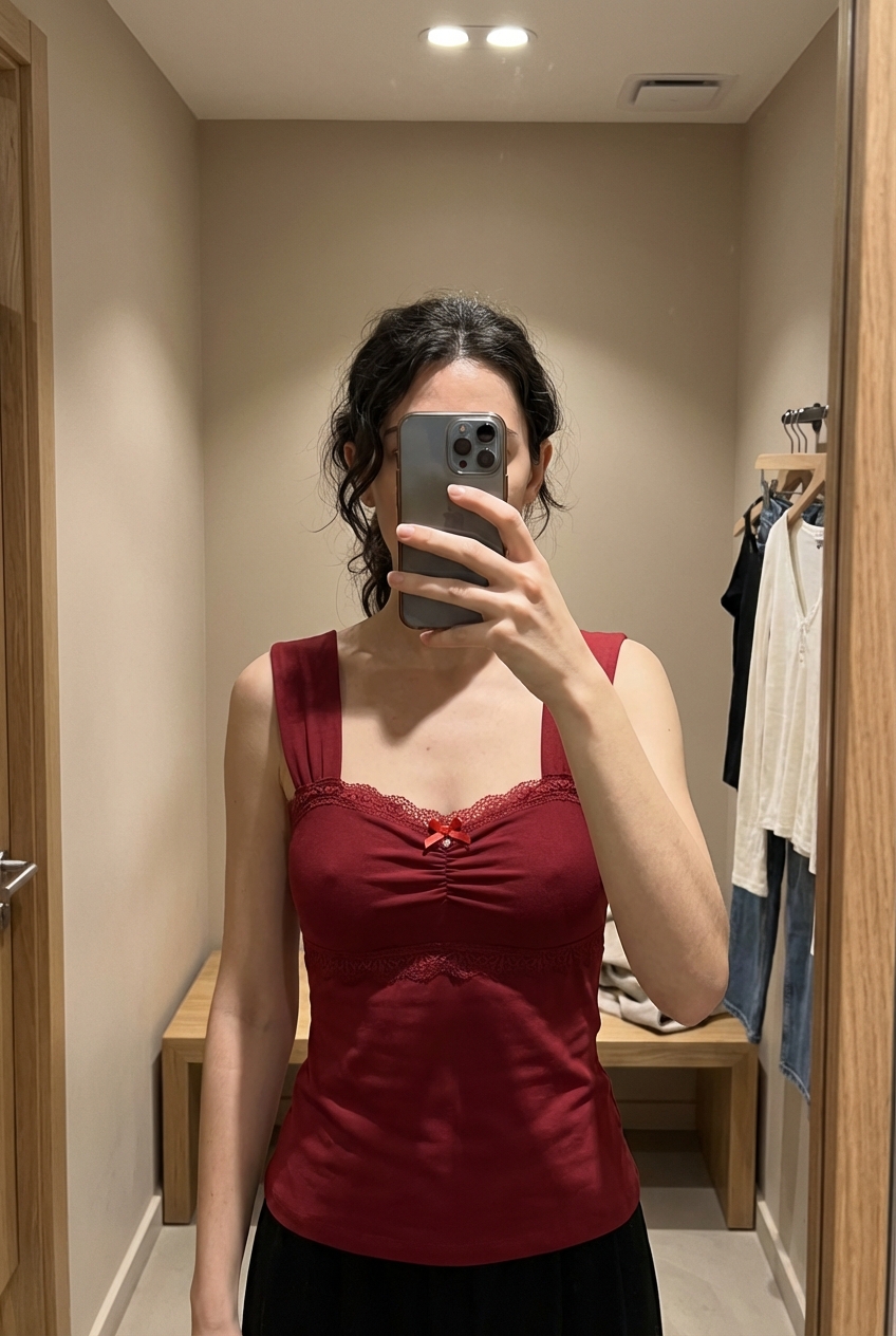 Une personne en Top débardeur glamour coquette debout, face à la caméra, avec une silhouette fine, dans une cabine d’essayage de style boutique avec un miroir et une décoration neutre.