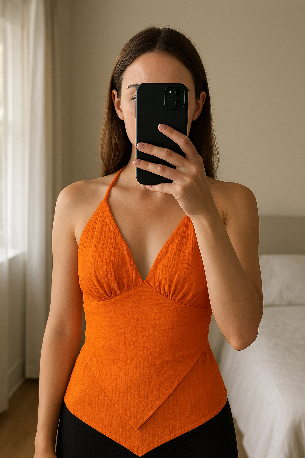 Top dos nu debout, face à la caméra, dans une chambre à la lumière douce, avec une lumière naturelle filtrant par la fenêtre.
