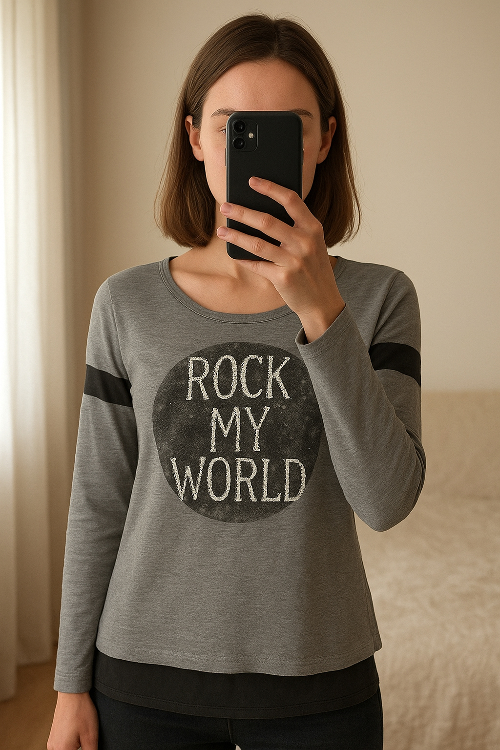 Top gris "Rock my world" avec strass – Cache Cache – Taille 1 (S) debout, face à la caméra, dans une chambre à la lumière douce, avec une lumière naturelle filtrant par la fenêtre.
