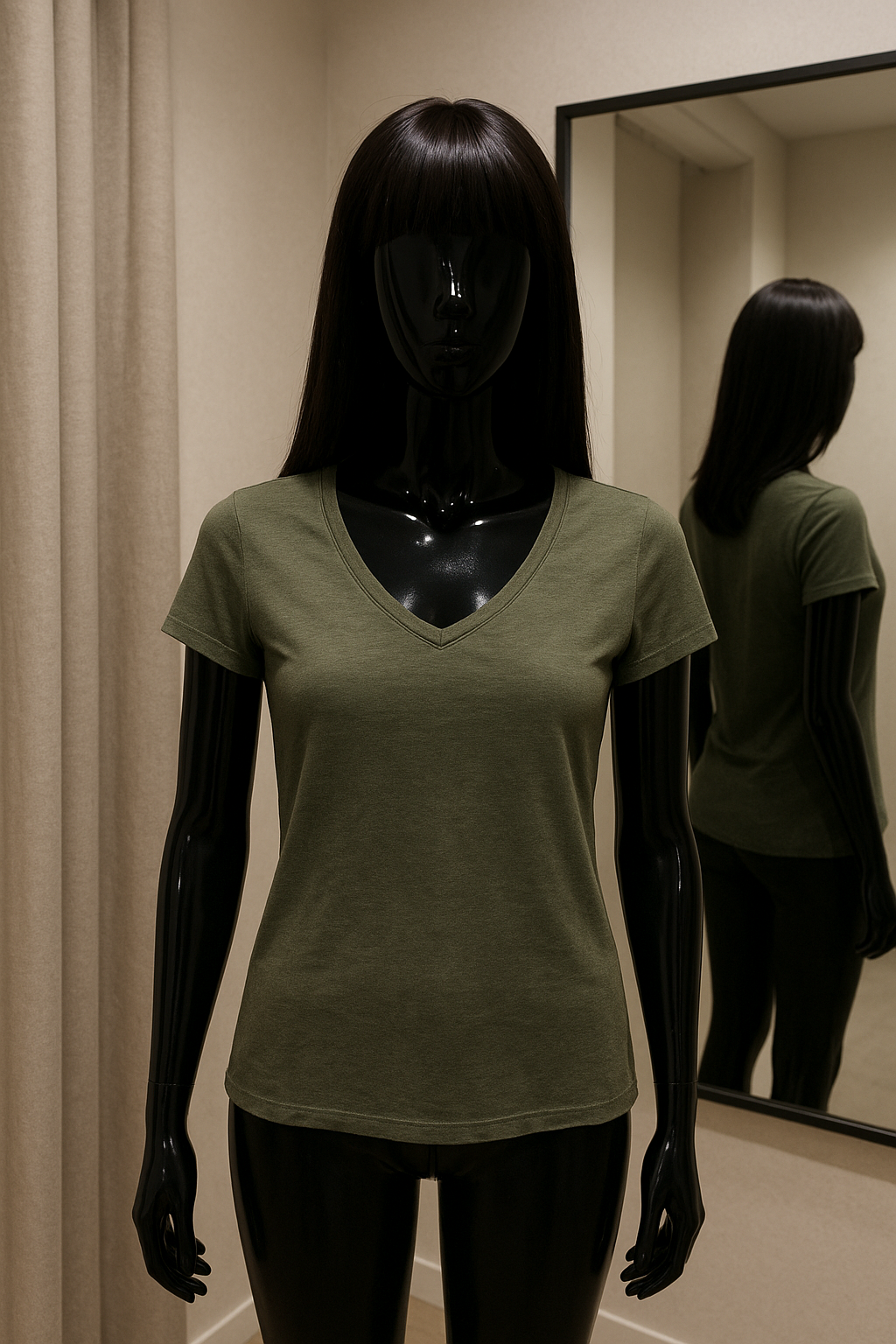 un mannequin noir brillant en plastique, sans traits du visage en Top manches 3/4 debout, face à la caméra, avec une silhouette fine, dans une cabine d’essayage de style boutique avec un miroir et une décoration neutre.