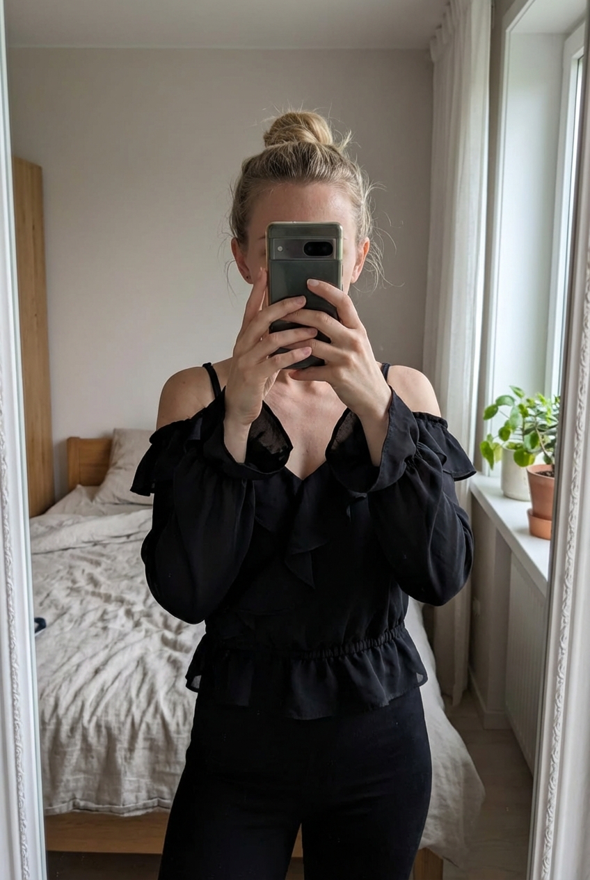 Top noir à bretelles H&M Taille XS 🖤 debout, face à la caméra, dans une chambre à la lumière douce, avec une lumière naturelle filtrant par la fenêtre.