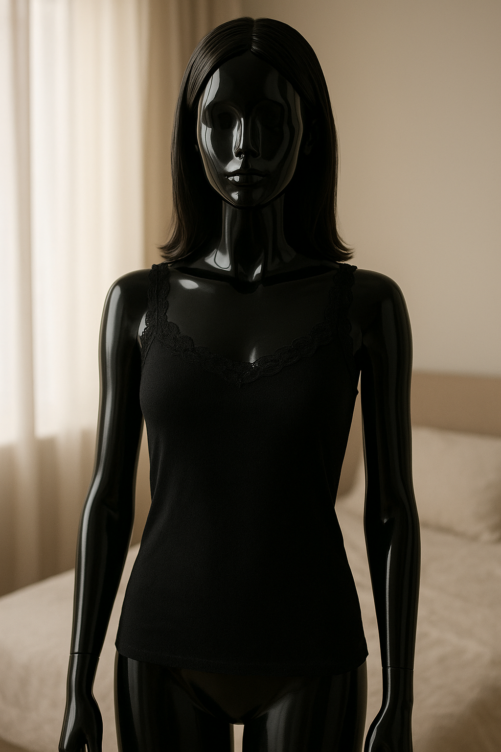 eine glänzende schwarze Kunststoffpuppe ohne Gesichtszüge in Top pizzo schwarz aufrecht stehend, der Kamera zugewandt, mit schlanker Figur, in einem sanft beleuchteten Schlafzimmer, mit natürlichem Licht, das durch ein Fenster fällt.