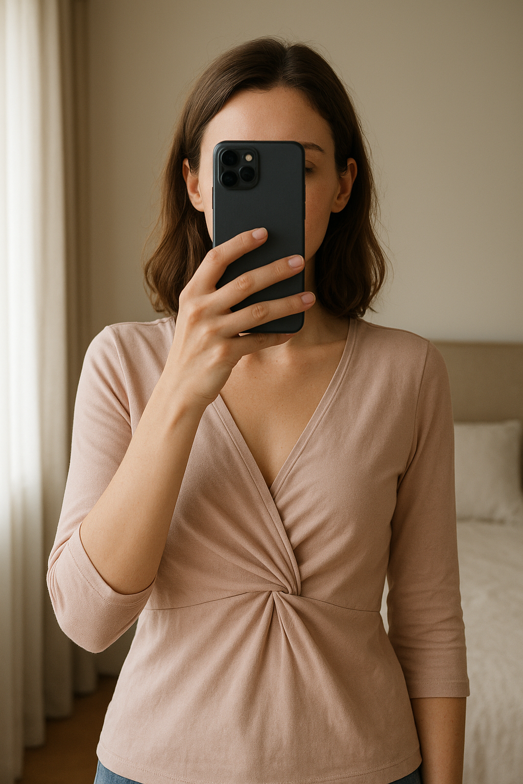 Top rose pale debout, face à la caméra, dans une chambre à la lumière douce, avec une lumière naturelle filtrant par la fenêtre.