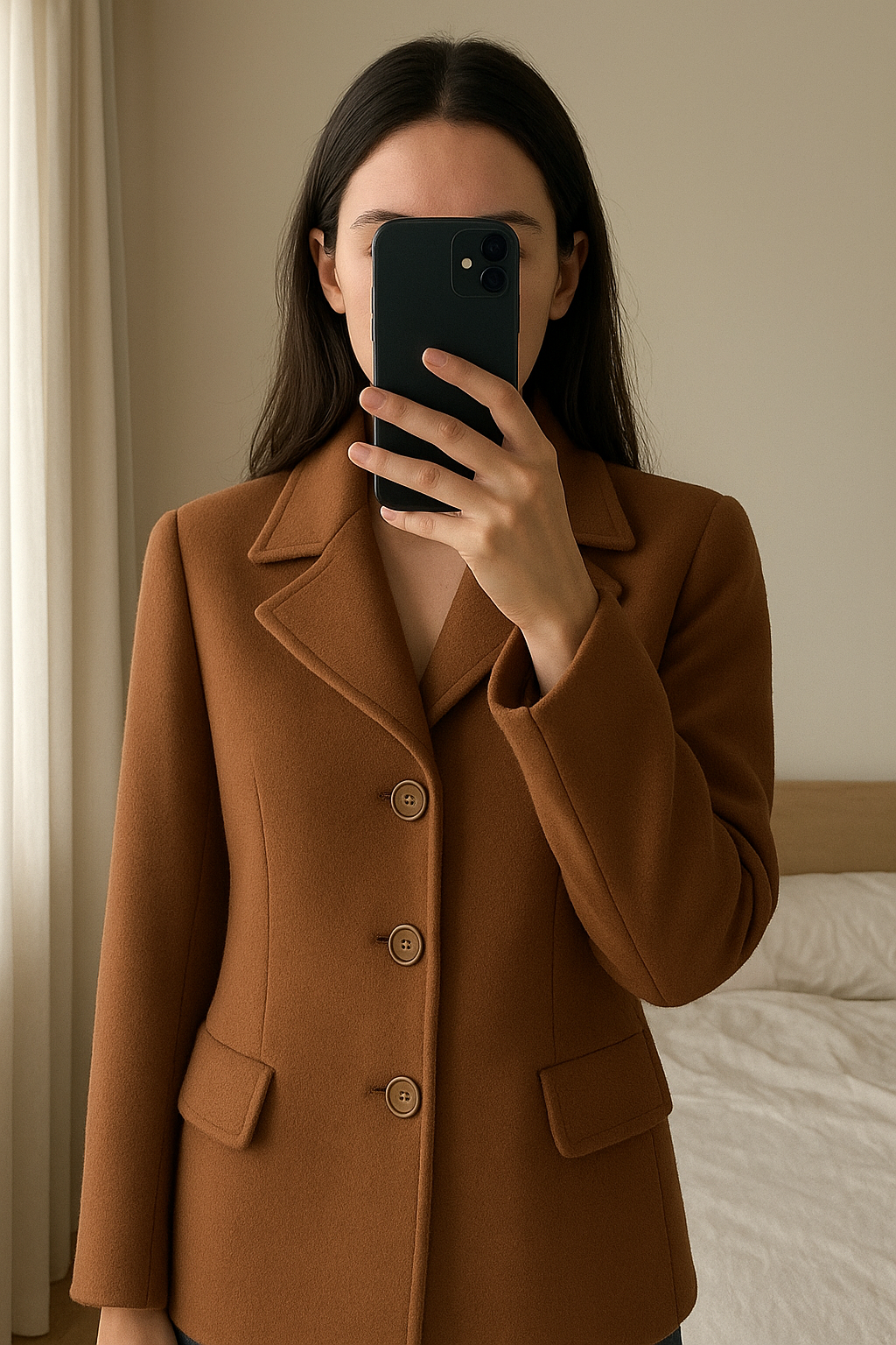 Très belle veste cachemire debout, face à la caméra, dans une chambre à la lumière douce, avec une lumière naturelle filtrant par la fenêtre.