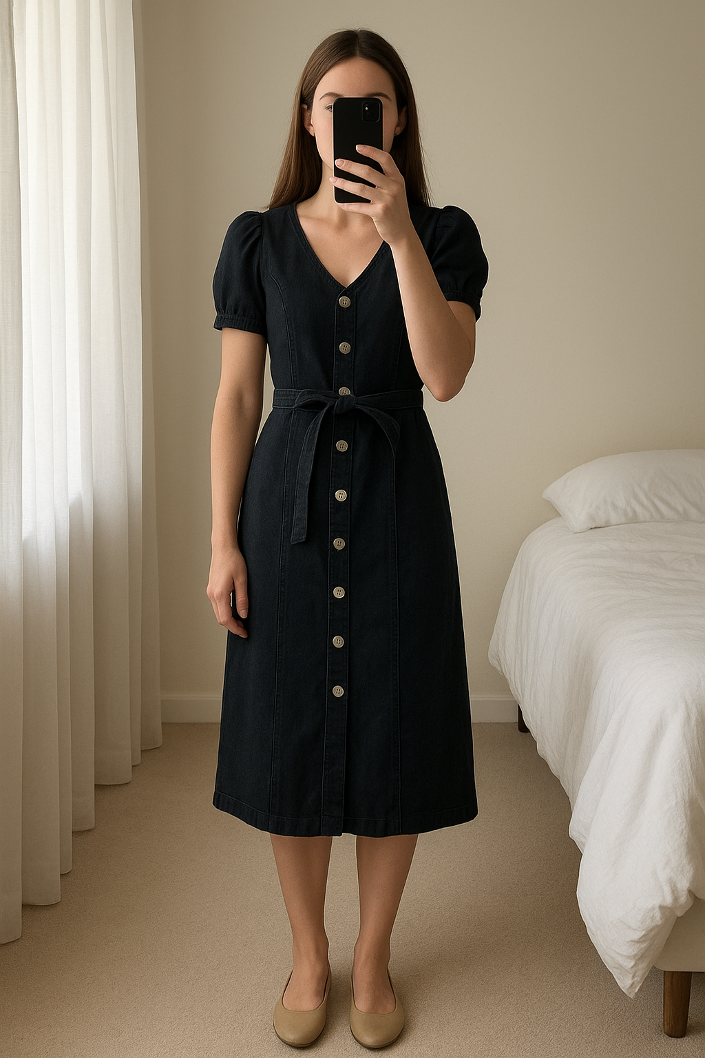 Traper milkmaid haljina standing straight facing the camera, in a softly lit bedroom setting, with gentle natural light filtering through a window.
