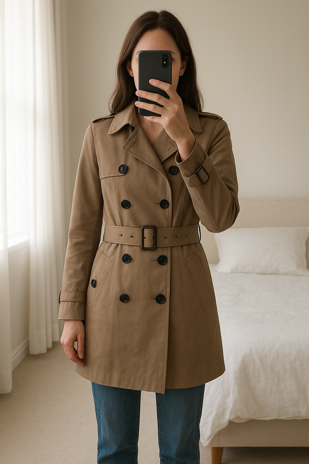 Trench comptoir des cotonniers debout, face à la caméra, dans une chambre à la lumière douce, avec une lumière naturelle filtrant par la fenêtre.