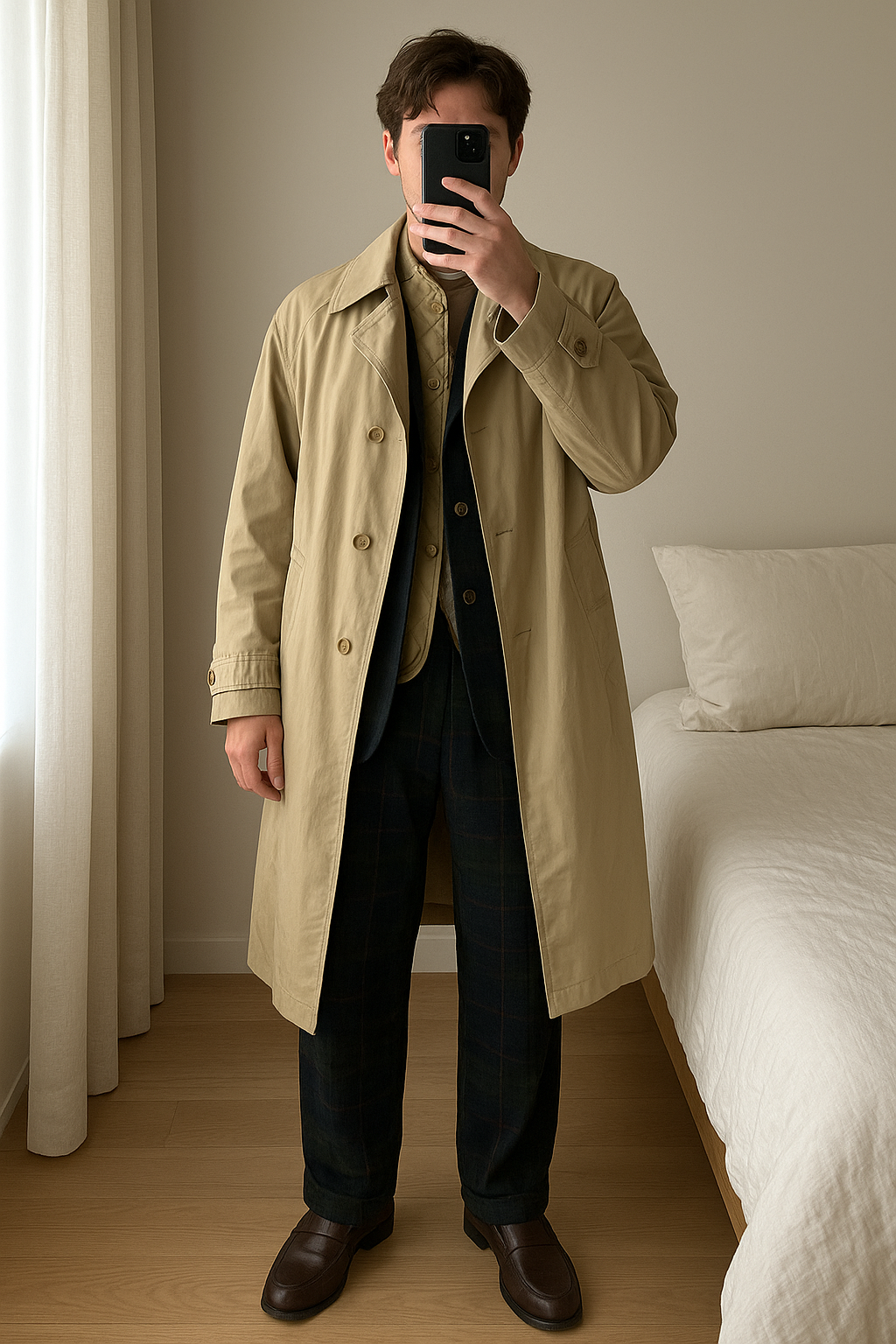 Trench homme Armand thiery debout, face à la caméra, dans une chambre à la lumière douce, avec une lumière naturelle filtrant par la fenêtre.