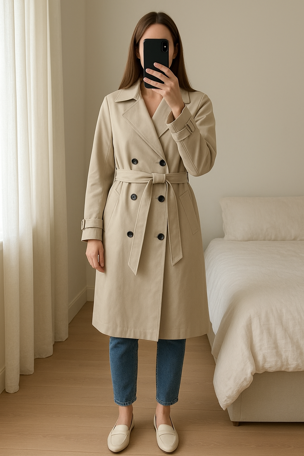 Trench oversize beige Morgan taille 38 debout, face à la caméra, dans une chambre à la lumière douce, avec une lumière naturelle filtrant par la fenêtre.