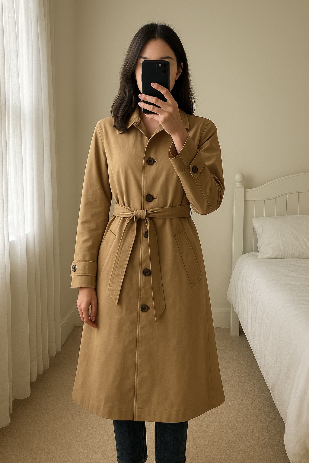 Trenchs fille Zara debout, face à la caméra, dans une chambre à la lumière douce, avec une lumière naturelle filtrant par la fenêtre.