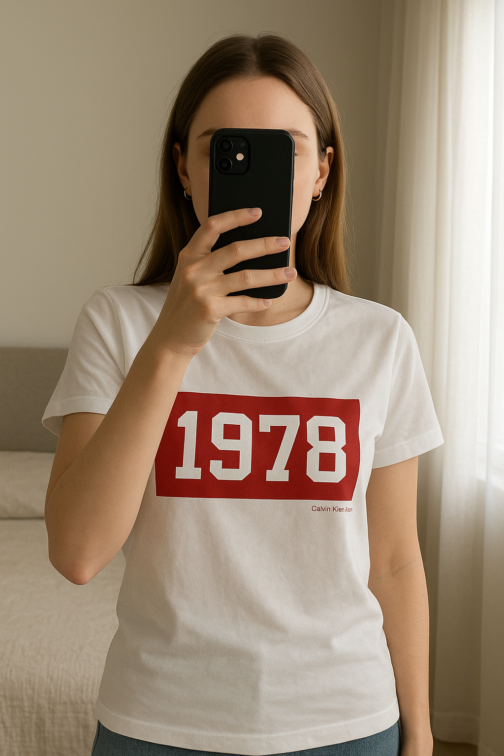 Tshirt bluzka damska Calvin Klein biała koszulka M standing straight facing the camera, in a softly lit bedroom setting, with gentle natural light filtering through a window.