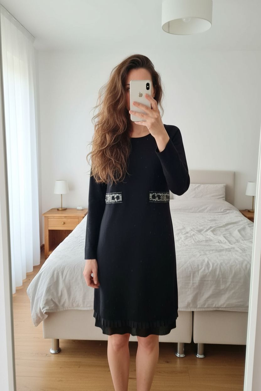 Tuzzi, Kleid, schwarz, Wolle, Pailetten, Gr. 38, Top Zustand Gr. 38 aufrecht stehend, der Kamera zugewandt, in einem sanft beleuchteten Schlafzimmer, mit natürlichem Licht, das durch ein Fenster fällt.